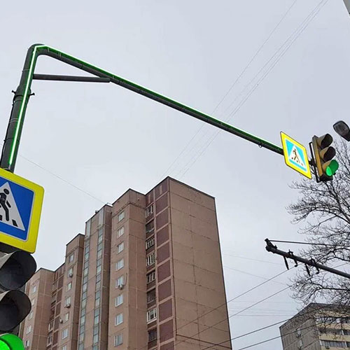 Отличие светофорных стоек в том, что светофоры устанавливаются не только на прямые опоры, но и с выносом над проезжей частью.